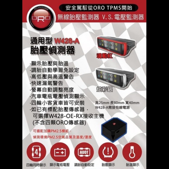 W428-A胎壓監測系統,包含四個發射器與一個接收顯示器,另可加購選配PM2.5&電瓶電壓檢測器,